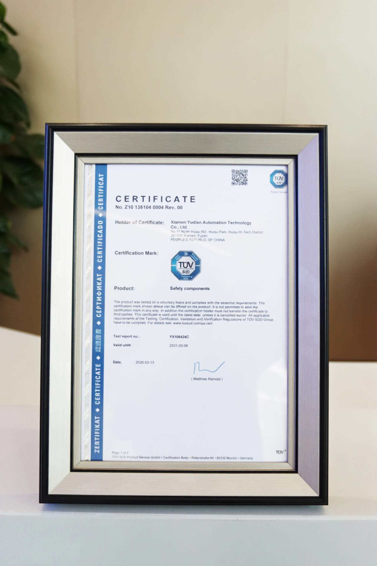 儀式現(xiàn)場,宋磊代表 TÜV南德向宇電頒發(fā)了認證證書。隨后,TÜV南德專家團隊為宇電研發(fā)、質量、生產(chǎn)等部門員工開展了定制化的功能安全體系專項培訓,并實地參觀了宇電智能化生產(chǎn)線。